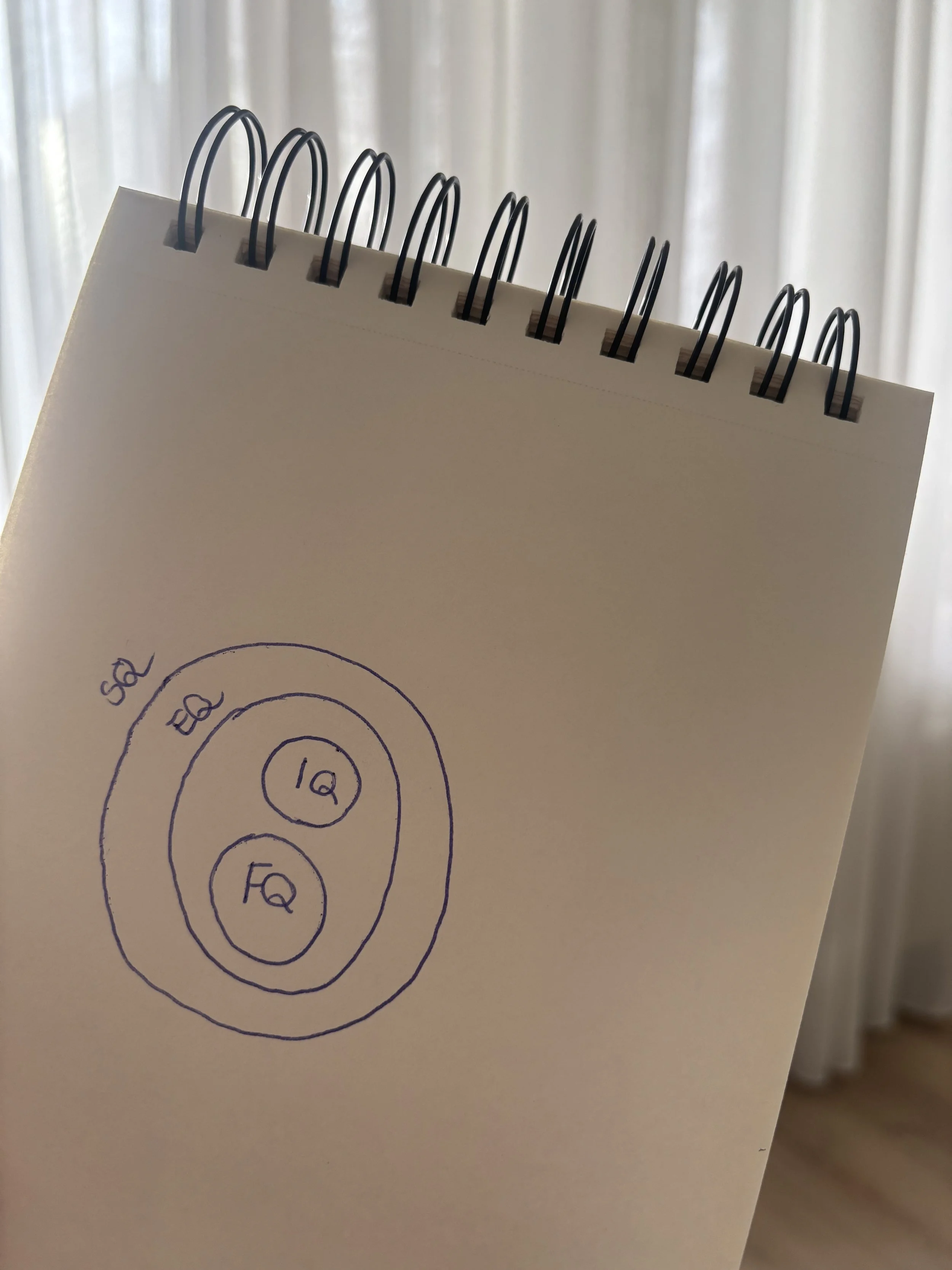De 4 vormen van intelligentie (IQ, FQ, EQ en SQ) en hoe ze zich tot elkaar verhouden.