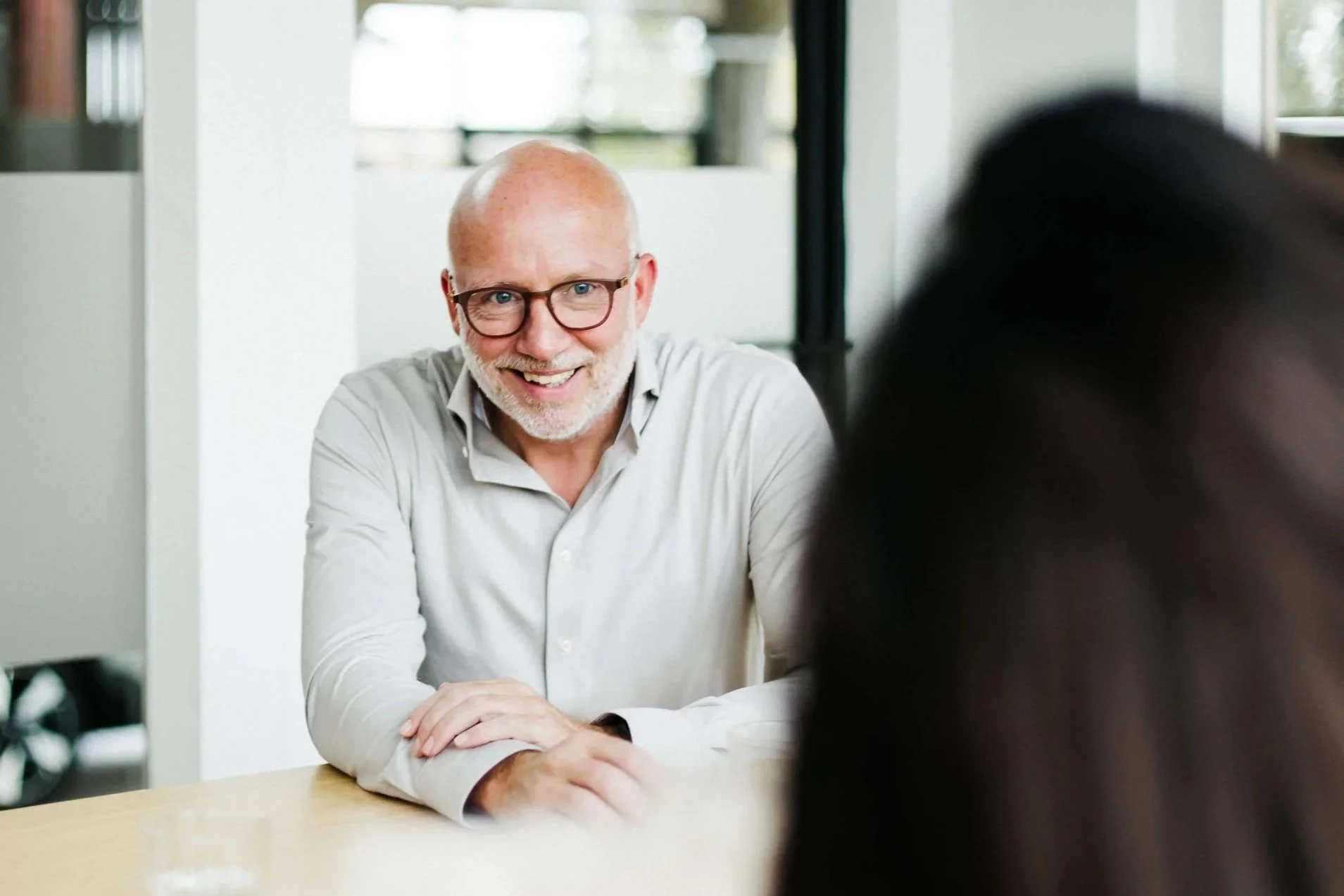 Cliënt: een vrouw met blond haar en een paar oorbellen zit aan een tafel, kijkt naar rechts, houdt een pen vast en heeft een notitieboekje voor zich. Op de tafel staan een witte kop en enkele gekleurde glazen flesjes.